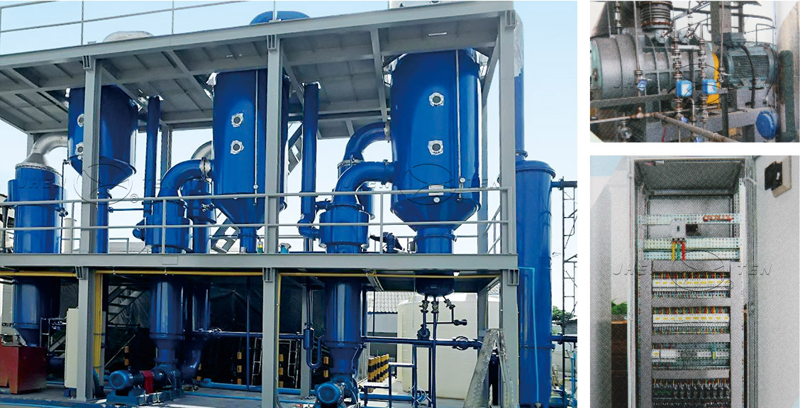 汽缸、各效加熱器、分離器、冷凝器(混合式或表?式)、各效強(qiáng)制循環(huán)泵、料液輸送泵、真空泵、冷凝?泵、操作平臺、電器儀表控制柜及界內(nèi)管道閥?等組成。